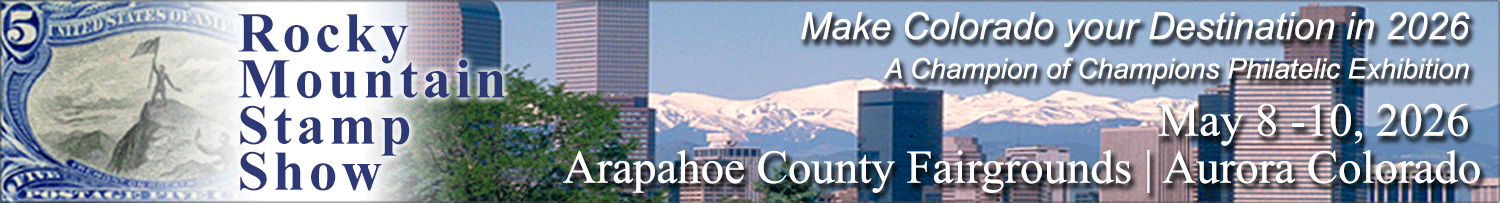 The 75th Rocky Mountain Stamp Show will take place May 8-10, 2026, at the Arapahoe County Fairgrounds in Aurora, CO. On behalf of our dedicated committee, I would like to welcome you to our website where you will be able to learn about our exhibits, dealers, activities, and so much more. We are excited to have the Universal Ship Cancellation Society with us at the show. This year we are expecting to fill the 400 available frames with world-class exhibits from the USCS and the participants in the AAPE-sponsored George Brett Cup Competition. Our bourse floor will accommodate 32 dealer booths and 13 society and activity booths providing something for collectors of all areas and topics. There will also be a Postcrossing Meetup, a highly anticipated part of our show. If you would like to learn more about Postcrossing, please visit www.postcrossing.com. We will be celebrating two events at our show: the 150th anniversary of Colorado statehood, and the 75th anniversary of our show. We will have our popular What’s in Your Attic? booth where you can learn about an inherited accumulation or rekindle your interest in a long-neglected collection. The CYPHER Stamp Club (Colorado Young Philatelic Explorers and Researchers) will have youth activities, including Stamp Collecting Merit Badge classes, scheduled throughout the show. Our show wouldn’t be complete without the Rocky Mountain Philatelic Library’s Silent Auction, a major fundraiser for this important volunteer-run philatelic community resource. There’s plenty happening this year - we’re looking forward to seeing you there!